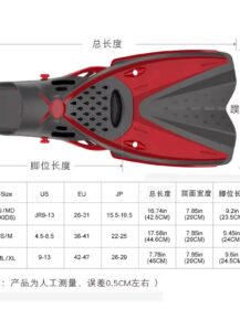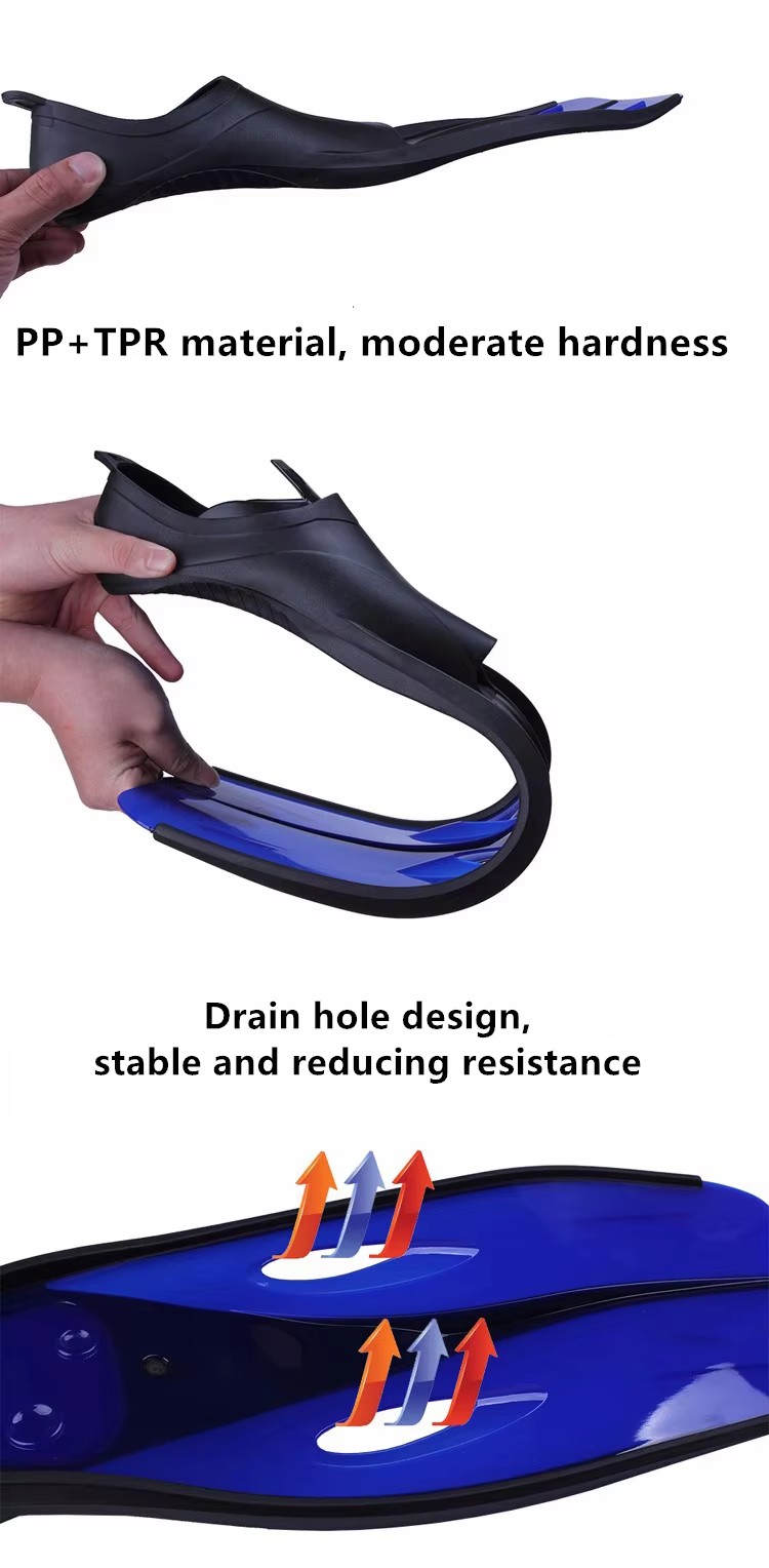 . This adult – specific swimming fin is made of high – quality TPR (Thermoplastic Rubber) as the main material, combining the rigidity of the PP (Polypropylene) blade with the softness of the TPR foot sleeve. It not only provides strong propulsion but also ensures a comfortable wearing experience for long – term use. Logo, color, and size can be customized in depth, making it an ideal training equipment for swimming clubs, diving centers, and professional athletes.